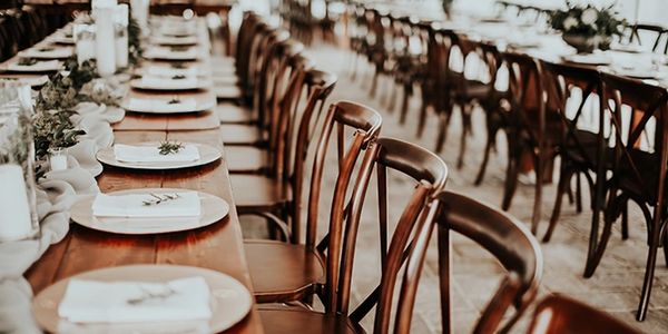 Different style tables are available to fit your needs. From standard 60" round dining tables, to 6" and 8' rectangular banquet tables, we have you covered. Want a rustic look? Try our farmhouse style 40" wide by 8' long tables with solid beech wood cross-back chairs. We also carry classic white folding wedding chairs (made with a super strong resin) that are affordable and look great.